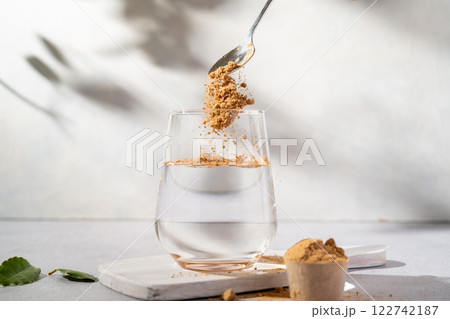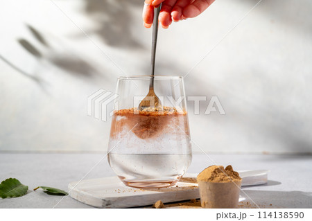 Protein collagen pink powder, fruits and vegetables powder, food supplement in a glass with water