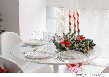 Festive Christmas table setting with frosted pine branches, candles, and white plates on round table