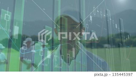 Standing golfer wearing light cap and polo shirt on fairway, showing financial data overlays