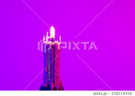 Texture vintage candle on a pink background with neon lighting, copy space.