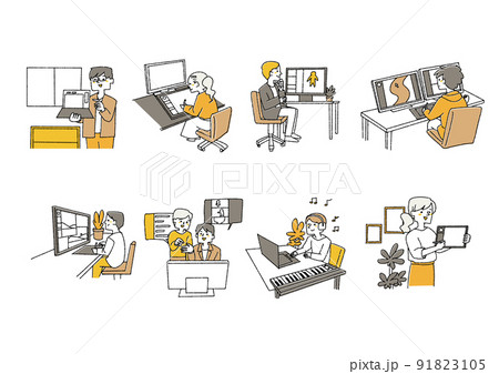 パソコンを使いクリエイティブな仕事をする人物のセット
