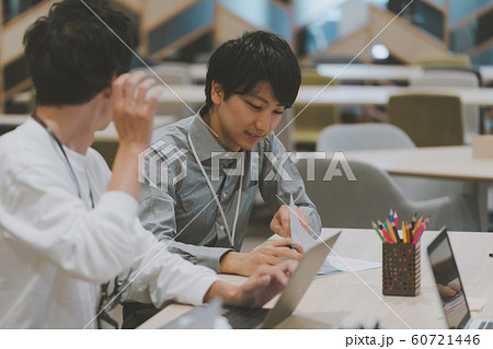 シナリオやコンテについて会話を交わすクリエイター パソコンを使いクリエイティブな仕事をする人