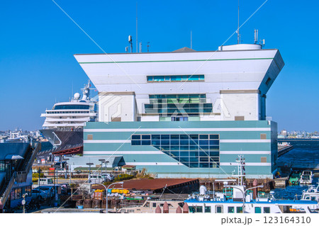 日本の横浜都市景観 初入港のクリスタル・シンフォニーなど望む。右に大さん橋=令和7年2月13日