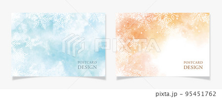 雪の結晶を散りばめたポストカードデザインB【ブルーとオレンジの水彩塗】