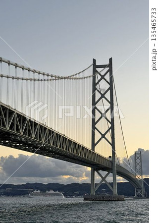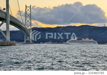 明石海峡大橋を通過するクルーズ客船 夕景
