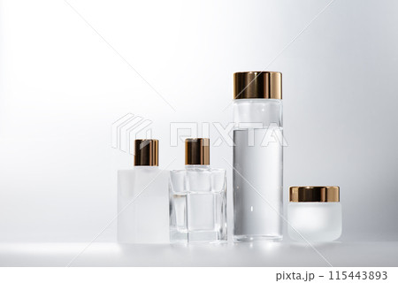 金色の蓋の硝子製化粧品ボトル3種類を白いサテン生地の上に並べたイメージ