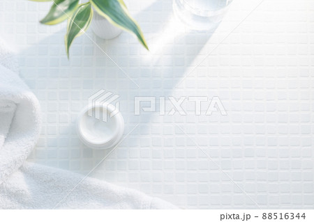 白いタイルに配置したミラーとタオルと保湿クリーム
