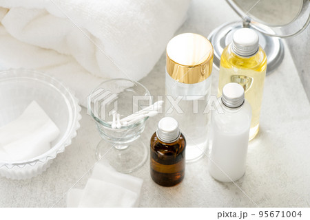 白いタオルとコットンとスキンケア化粧品の朝のお手入れイメージ