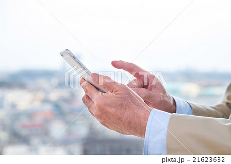 都市風景 おじいちゃんの手元 スマホを操作するシニア スマートフォンを操作するおじいちゃん