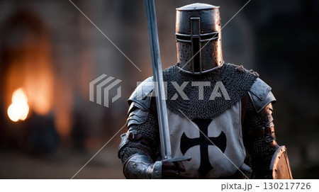 Crusader Knight standing in battle holding sword. Crusader knight in weathered armor holding a sword against a fiery battlefield
