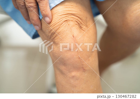 Asian elderly woman patient show her scars surgical total knee joint replacement Suture wound surgery arthroplasty.