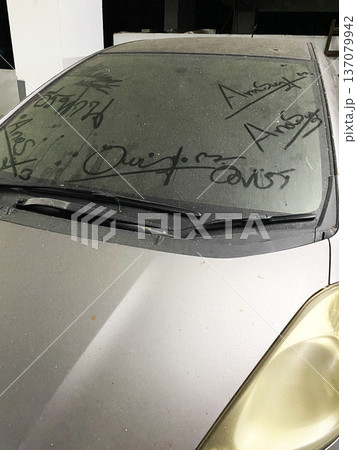 Dirty car windshield covered in dust and scratches with visible graffiti markings, showcasing a neglected vehicle parked in an indoor garage environment