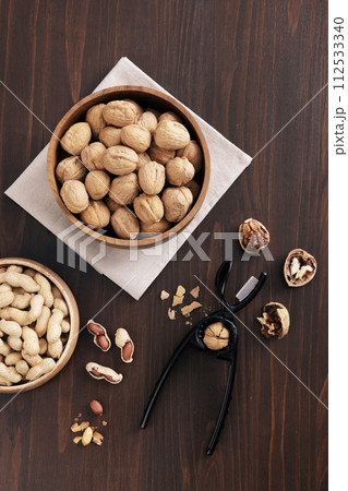 Walnuts and hazelnuts nuts open with a vintage nut cracker
