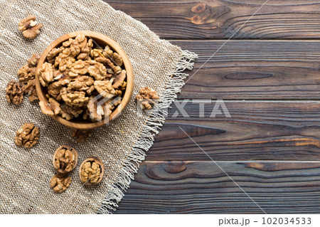 Fresh healthy walnuts in bowl on colored table background. Top view Healthy eating bertholletia concept. Super foods