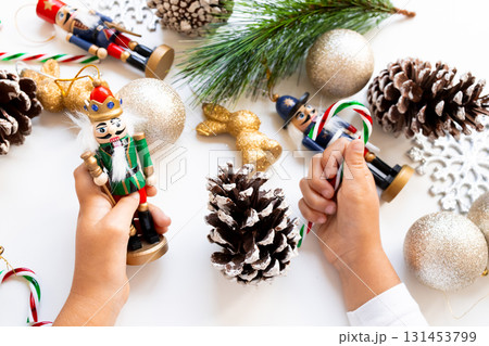 Festive nutcracker decorations with glitter ornaments and pinecones