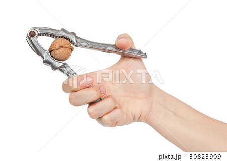 Woman hand is cracking a walnut with nutcracker