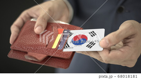 Man pulls credit card with flag of South Korea out of his wallet, fictional card number