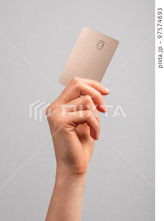 Hand holding credit card mockup with chip. Buying at stores, making transactions at terminals. Secure payments