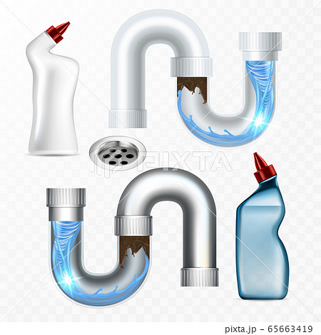 Clogged Pipe, Drain And Cleanser Bottle Set Vector