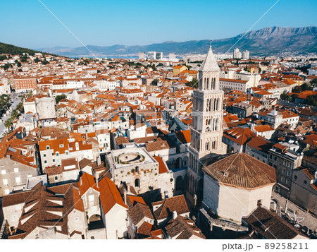 Aerial drone shot of Split with old port in Croatia sunrise hour