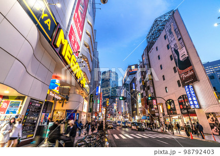 日本の東京都市景観 渋谷駅前。賑わうMEGドンキ前。奥に渋谷スクランブルスクエア=1月31 日