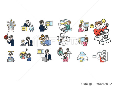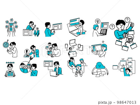 ソフトウエア、ウエブサイト、アプリ開発の提案に関するイラストのセット