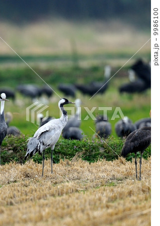 タンチョウの中に紛れて飛来したクロヅル(北海道)