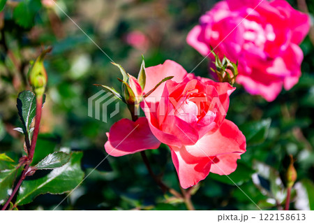 秋の美しい景色 カラフルに咲いた満開の秋バラ