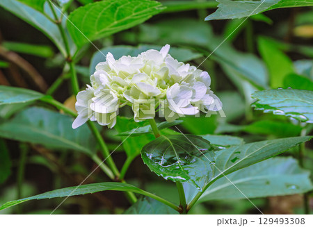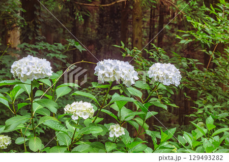 美しい光芒に映える白い紫陽花の装飾花クローズアップ (観光スポット俵山 交流館 萌の里)