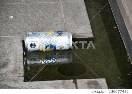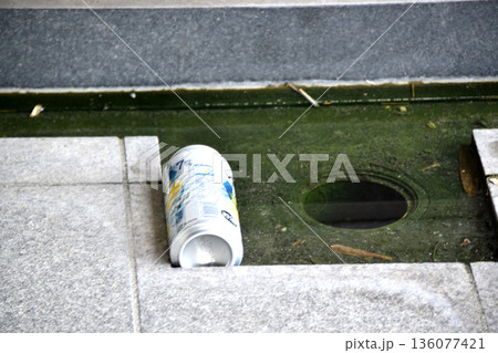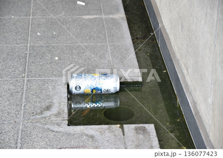 ポイ捨てされ側溝に浮かぶアルミ缶