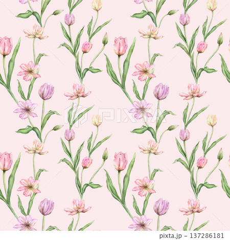 Seamless pattern of pastel pink light violet yellow bud Tulips watercolor illustration isolated on background. Hand drawn delicate spring perennial bulbous flower for spring wedding repeat design