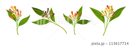 Clove Tree Branch with Ripe Aromatic Flower Bud and Green Leaf on Stem Vector Set