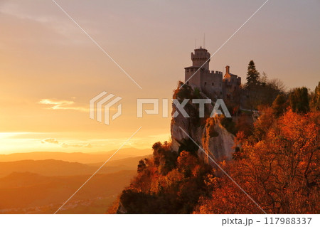 イタリアに囲まれたサンマリノ共和国 世界遺産ティターノ山の断崖の城砦チェスタの塔と朝焼け空