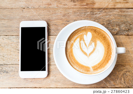 Cup of coffee with heart pattern in a white cup and smart phone on wooden background, clipping path inside