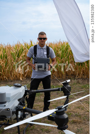 Drone operator standing in a corn field with remote controller and industrial drone during a farming project