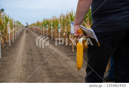 Man in a cornfield presents corn ear and clipboard, highlighting farming, harvest, and agricultural research in a rural setting