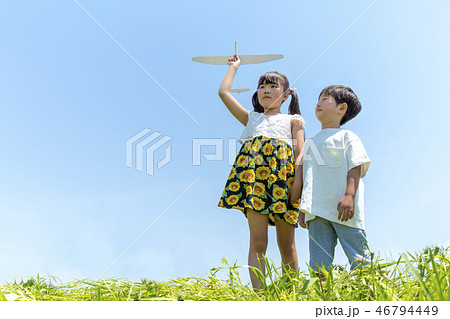 土手で紙飛行機を飛ばす姉弟2人