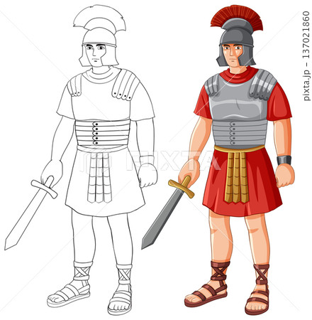 Ancient Roman Soldier Vector Illustration with Line Art and Colored Version