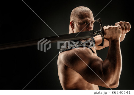 Portrait of handsome muscular gladiator with sword. Isolated. Studio shot.