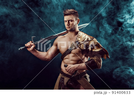 Severe barbarian in leather costume with sword