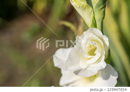 朝日に照らされた白いグラジオラスの花