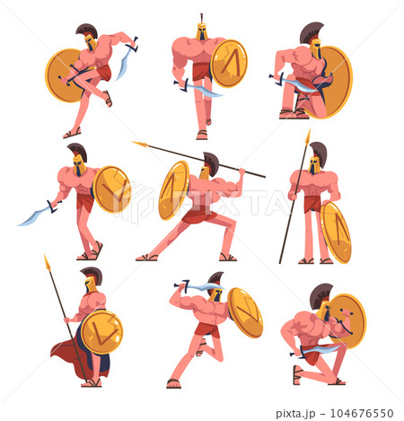 Man Spartan Soldier or Warrior in Helmet with Spear and Shield Vector Set