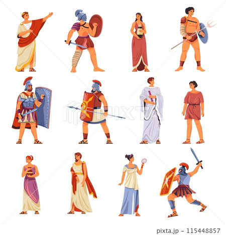 Ancient rome characters. Historic roman greek people greece civilization, gladiator auxiliary soldier caesar emperor hierarchy aristocrat class in toga, recent vector illustration
