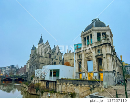 Cinematic wide-angle photograph of gothic-style architecture in Ghent