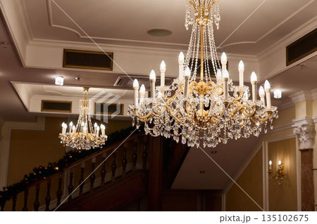 Grand chandelier with multiple candle-style bulbs hanging from ornate ceiling. Luxury, heritage architecture, and cultural opulence representing grandeur and interior elegance.
