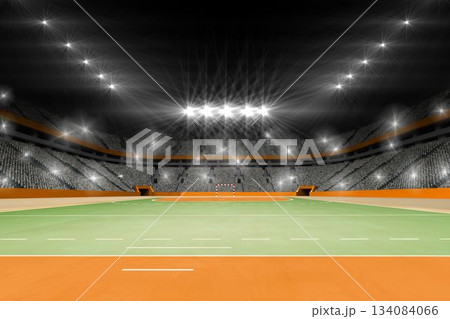 Displaying empty stadium with green field, orange border, floodlights, goalpost, tiered seating