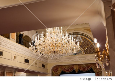 Magnificent Chandelier With Shimmering Crystals And Gilded Frame Embellishing Grand Stage Area