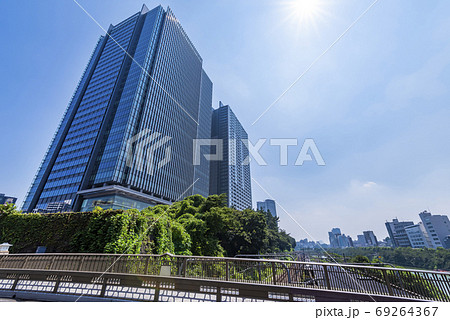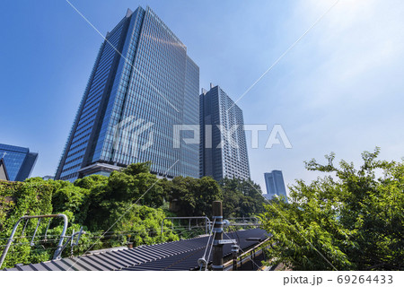 日本の東京都市景観 飯田橋駅周辺の街や神楽坂などを望む。手前は千鳥ヶ淵、三番町住宅なども見える
