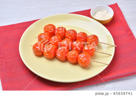 プチトマトの串焼き、ミニトマトの焼鳥風。プチトマト、竹串、グリル料理、野菜料理。
