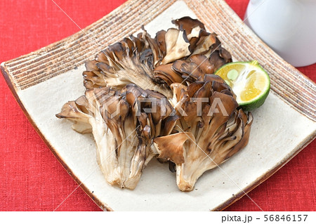焼きマイタケ、焼き舞茸、焼きまいたけ、シンプルなグリル焼きキノコ料理。シークヮーサーを添えて。
